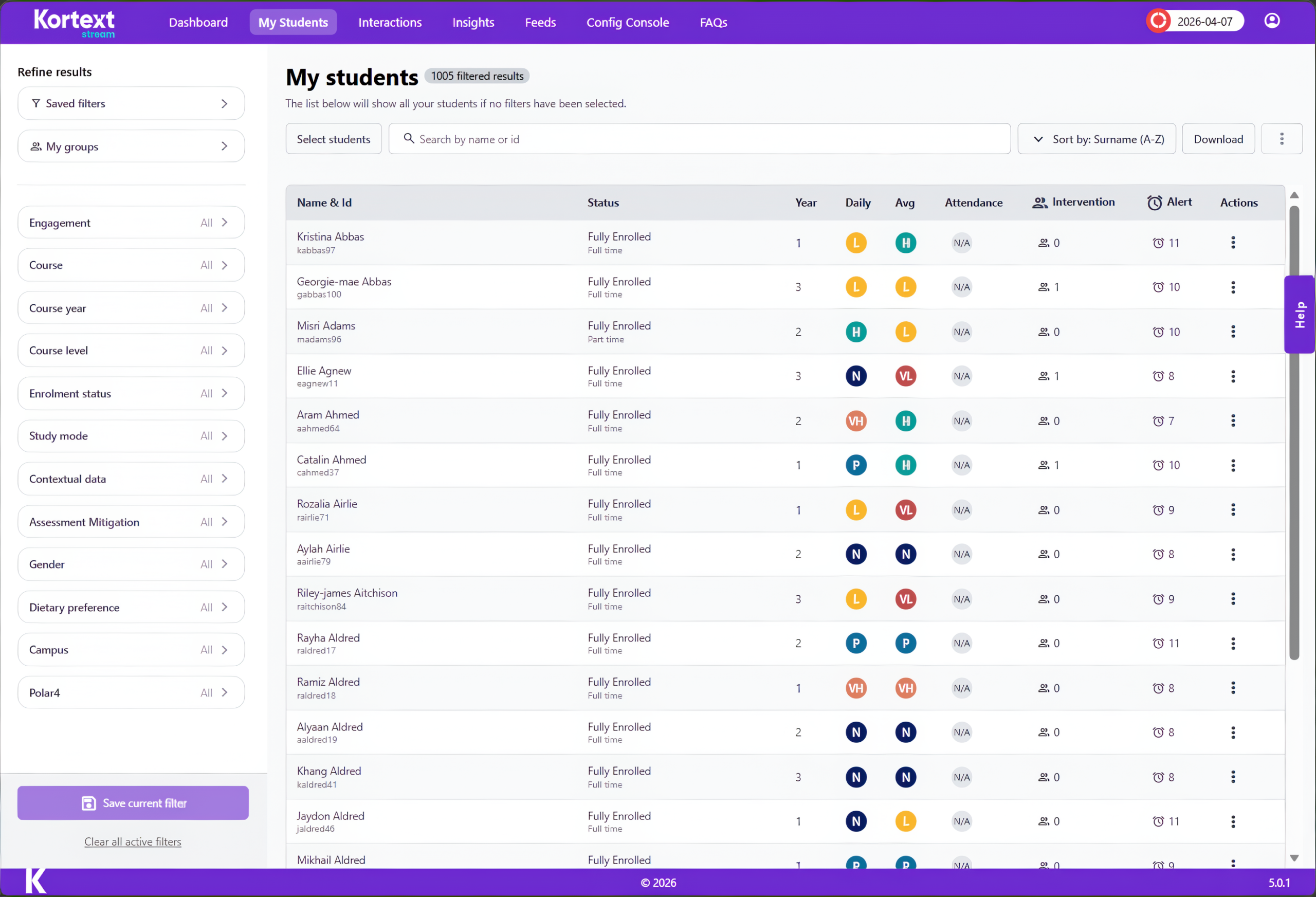 Daily engagement scores for your whole student cohort