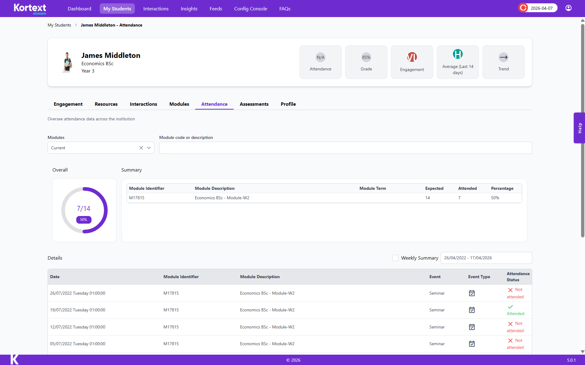 See how well engaged student is at a glance with headline data for each individual student.